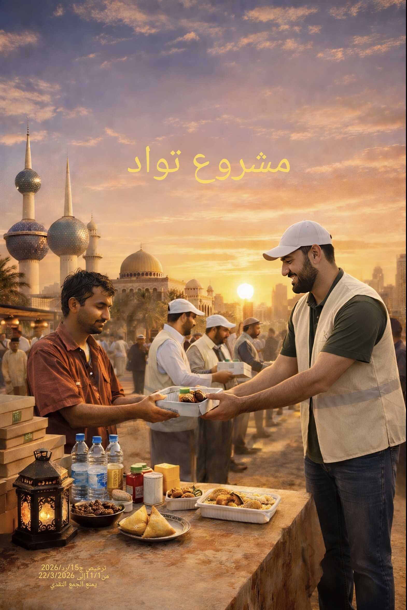 مشروع لتوزيع وجبات الإفطار داخل الكويت على أصحاب الدخل المحدود من العاملين في منطقة جليب الشيوخ يتم على أيدي شباب متطوعين في جمعية قوافل .قيمة الوجبة 1دك.ترخيص وزارة الشؤون ج15/رد/2026من 11/1 إلى 22/3/2026،النسبة الإدارية لا تتجاوز 12.5%