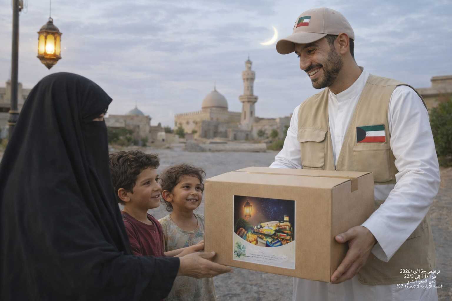مشروع لتوزيع وجبات الإفطار داخل الكويت على أصحاب الدخل المحدود من العاملين في منطقة جليب الشيوخ يتم على أيدي شباب متطوعين في جمعية قوافل .قيمة الوجبة 1دك.ترخيص وزارة الشؤون ج15/رد/2026من 11/1 إلى 22/3/2026،النسبة الإدارية لا تتجاوز 7%